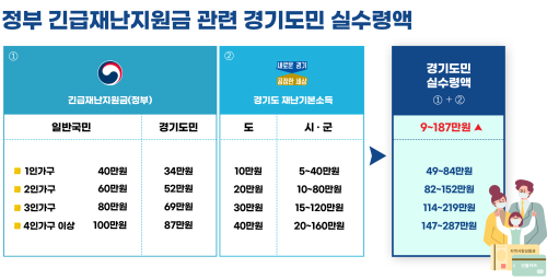 ¿¹¸¦ µé¾î ´Ù¸¥ ½Ãµµ 1ÀÎ °¡±¸ÀÇ °æ¿ì Á¤ºÎ ±ä±ÞÀç³Áö¿ø±ÝÀÌ 40¸¸¿ø ±Ô¸ðÀÎ ¹Ý¸é, °æ±âµµ³» 1ÀÎ °¡±¸´Â °æ±âµµ¿Í ½Ã±º, Á¤ºÎÁö¿ø±Ý±îÁö ¸ðµÎ ÇÕ»êÇØ 49¸¸~84¸¸¿øÀ» ¼ö·ÉÇÏ´Â ±¸Á¶´Ù. 4ÀÎ °¡±¸·Î µûÁö¸é Á¤ºÎ ±ä±ÞÀç³Áö¿ø±ÝÀÌ 100¸¸¿ø ±Ô¸ðÁö¸¸, °æ±âµµ³» 4Àΰ¡±¸ÀÇ ½Ç ¼ö·É¾×Àº 147~287¸¸¿øÀÌ µÈ´Ù.