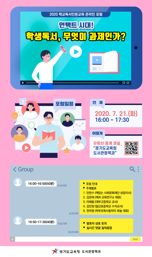 À̹ø Æ÷·³¿¡¼´Â ‘ºñ´ë¸é ½Ã´ë! Çлý µ¶¼, ¹«¾ùÀÌ °úÁ¦Àΰ¡?’¸¦ Å« ÁÖÁ¦·Î Á¤Çϰí, ¡ã¿Â¶óÀÎ ±³À° ½Ã´ë¿Í ÇлýµéÀÇ »çȸÀû µ¶¼, ¡ã³Ê¹« ¸¹¾ÆÁø ȸéÀÇ ½Ã°£, ¾î¶² ÀбⰡ ÇÊ¿äÇÒ±î?, ¡ã¼ö¾÷ ½Ã°£¿¡ Ã¥ Àбâ, Ãʵ½ÇÀÇ °í¹Î, ¡ãÁö±Ý »óȲ¿¡¼ ¼ºÀå µ¶¼ ¾î¶»°Ô ÇÒ °ÍÀΰ¡?, ¡ãÁýÄÛ! ¹æÄÛ! ½Ã´ë Çкθð´Â ¹«¾ùÀ» °í¹ÎÇϰí Àִ°¡? µîÀÇ ÀÛÀº ÁÖÁ¦º° ÅäÀǸ¦ ÁøÇàÇÑ´Ù.