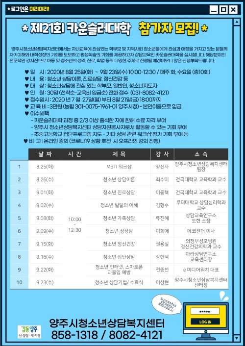 ¾çÁÖ½Ãû¼Ò³â»ó´ãº¹Áö¼¾ÅÍ´Â ¿À´Â 8¿ù21ÀϱîÁö Á¦21ȸ Ä«¿î½½·¯´ëÇÐ Âü°¡ÀÚ 30¸íÀ» ¼±Âø¼øÀ¸·Î ¸ðÁýÇÑ´Ù°í ¹àÇû´Ù.