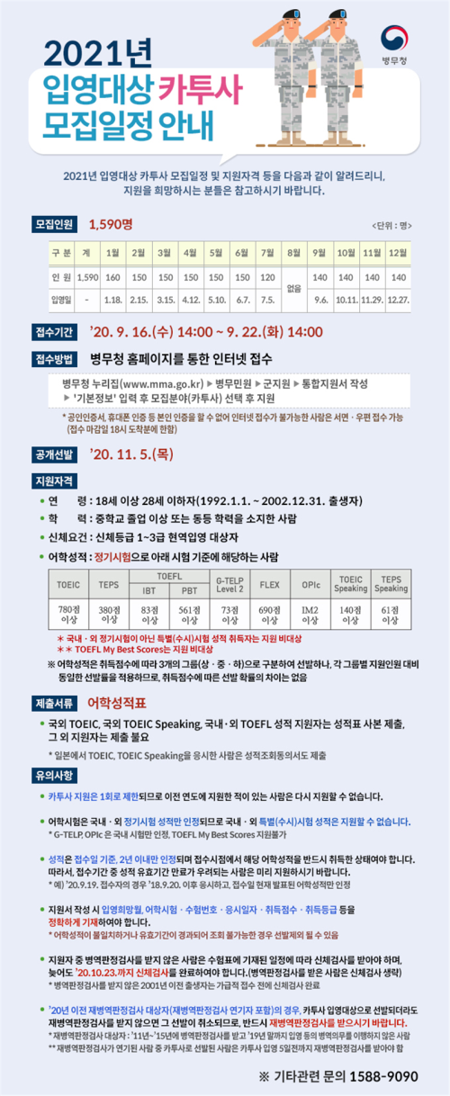 °æ±âºÏºÎº´¹«Áöû(ÁöûÀå ¹Î¼±±â)Àº 2021³â¿¡ ÀÔ¿µÇÏ´Â Ä«Åõ»ç(KATUSA, ÁÖÇѹ̱º ºÎ´ë¿¡ ¹è¼ÓµÈ Çѱ¹±º)¸¦ 9¿ù16ÀϺÎÅÍ º´¹«Ã» ´©¸®ÁýÀ» ÅëÇØ ¸ðÁýÇÑ´Ù.