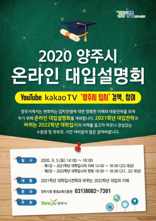 ¾çÁÖ½Ã(½ÃÀå À̼ºÈ£)´Â ¿À´Â 9¿ù5ÀÏ ´ëÇÐÁøÇÐÀ» ¾ÕµÐ °ü³» °íµîÇб³ ÇлýµéÀÇ ÁøÇм³°è¸¦ Áö¿øÇϱâ À§ÇØ 2020³â ¿Â¶óÀÎ ´ëÇÐÀԽü³¸íȸ¸¦ °³ÃÖÇÑ´Ù.