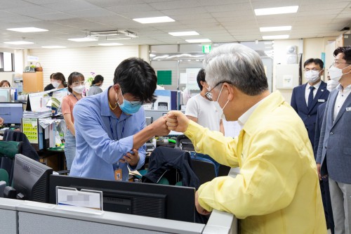 ÀÌÀç¸í Áö»ç´Â Áö³ 28ÀÏ ¿ÀÈÄ 2½Ã 40ºÐ°æ Äڷγª19±ä±Þ´ëÃ¥´Ü°ú °¨¿°º´°ü¸®°ú »ç¹«½ÇÀ» ÀÌ¾î ¹æ¹®ÇÏ°í ±Ù¹« ÁßÀÎ Á÷¿øµéÀ» °Ý·ÁÇß´Ù.