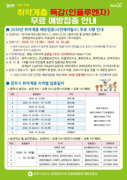 ¶ÇÇÑ ¸¸ 19¼¼ºÎÅÍ ¸¸ 61¼¼ ÀÌÇÏ ¾çÁֽùΠ°¡¿îµ¥ ÀÇ·á±Þ¿©·»ý°è±Þ¿© ±âÃÊ»ýȰ¼ö±ÞÀÚ, Àå¾ÖÀÎ, ±¹°¡À¯°øÀÚ µî Ãë¾à°èÃþÀº 10¿ù13ÀϺÎÅÍ 30ÀϱîÁö ¾çÁֽà º¸°Ç¼Ò, º¸°ÇÁö¼Ò, º¸°ÇÁø·á¼Ò¿¡¼ ¹«·á·Î Á¢Á¾¹ÞÀ» ¼ö ÀÖ´Ù.