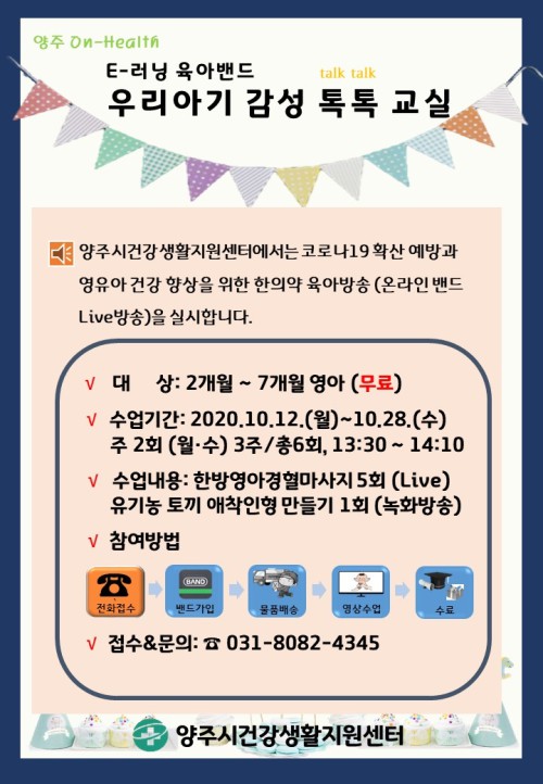 ¾çÁÖ½Ã(½ÃÀå À̼ºÈ£)´Â Äڷγª19 °¨¿° ¿¹¹æÀ» À§ÇÑ ºñ´ë¸é °Ç°ÁõÁø»ç¾÷ ‘¾çÁÖ On-Health’ÀÇ ÀÏȯÀ¸·Î ÇÑÀÇ¾à ¿Â¶óÀιêµå ‘¿ì¸®¾Æ±â °¨¼º ÅåÅå ±³½Ç’ 3±â Âü¿©ÀÚ¸¦ ¸ðÁýÇÑ´Ù.