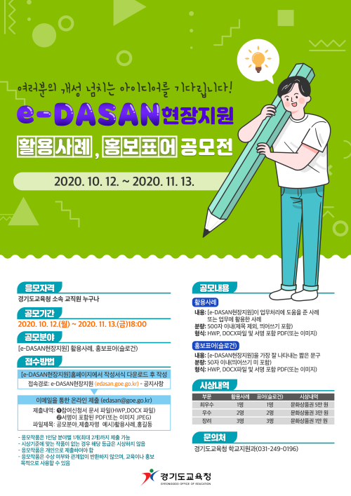 µµ±³À°Ã» Á¶ÇÑÀÏ Çб³Áö¿ø°úÀåÀº “´ç¼±ÀÛÀº 'e-DASANÇöÀåÁö¿ø' È«º¸¸¦ À§ÇØ È°¿ëÇϰí, À̹ø °ø¸ð¸¦ ÅëÇØ ´õ ¸¹Àº ±³Á÷¿øÀÌ ½Ã½ºÅÛÀ» »ç¿ëÇÏ±æ ¹Ù¶õ´Ù”¸ç, “Çб³ ÀÚÀ² °æ¿µÀ» Ȱ¼ºÈÇÏ°í ±³Á÷¿ø ¿ª·®À» ³ôÀ̱â À§ÇØ Àû±Ø Áö¿øÇÏ´Â 'e-DASANÇöÀåÁö¿ø'ÀÌ µÇ°Ú´Ù”°í ¸»Çß´Ù.