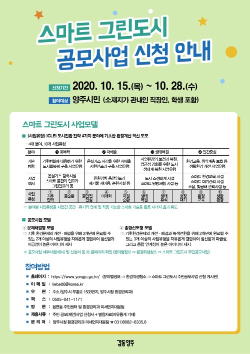 ¾çÁÖ½Ã(½ÃÀå À̼ºÈ£)´Â ¾çÁÖ ¸ÂÃãÇü ½º¸¶Æ® ±×¸°µµ½Ã »ç¾÷¸ðµ¨ ¹ß±¼À» À§ÇÑ ½Ã¹Î °ø¸ð»ç¾÷À» ÃßÁøÇÑ´Ù.