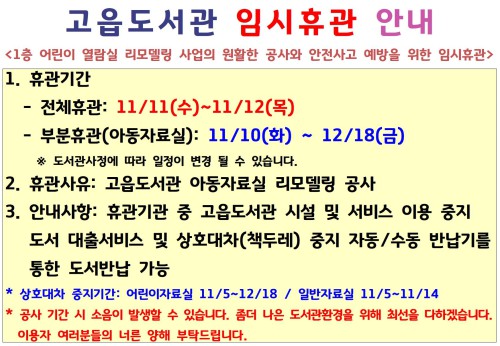 ÀÌ¿¡ °íÀ¾µµ¼°üÀº ¿øÈ°ÇÑ °ø»ç ÁøÇàÀ» À§ÇØ ¿À´Â 10ÀϺÎÅÍ 12¿ù 18ÀϱîÁö ¾î¸°ÀÌ ÀÚ·á½ÇÀ» Àӽà ÈÞ°üÇÒ °èȹÀÌ´Ù.