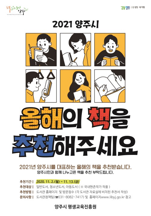 ¾çÁÖ½Ã(½ÃÀå À̼ºÈ£)°¡ ¿À´Â 13ÀϱîÁö Ã¥À¸·Î Çϳª µÇ´Â “Ã¥ Àд µµ½Ã ¾çÁÖ” Á¶¼ºÀ» À§ÇØ ‘2021³â ¾çÁֽà ¿ÃÇØÀÇ Ã¥’À» Ãßõ¹Þ´Â´Ù.