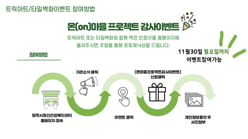 À̺¥Æ® Âü¿©¸¦ ¿øÇÏ´Â ¾çÁֽùÎÀº ´©±¸³ª ŸÀϺ®È¿Í Æ®¸¯¾ÆÆ® ÀÛǰ¿¡¼ ÀÎÁõ¼¦À» ÃÔ¿µÇØ ¾çÁÖ½ÃÁ¤½Å°Ç°º¹Áö¼¾ÅÍ È¨ÆäÀÌÁö(www.yjgreenmind.com)¿¡¼ °³ÀÎÁ¤º¸µ¿ÀÇ ÈÄ »çÁøÀ» ¿Ã¸®¸é µÈ´Ù.
