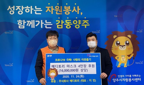 ¾çÁÖ½ÃÀÚ¿øºÀ»ç¼¾ÅÍ(¼¾ÅÍÀå ¹ÚÁ¾¼º)´Â Áö³ 24ÀÏ »ï¼þµ¿ ¼ÒÀç ¢ß¸ÞµðÅ丮(´ëÇ¥ Áö¹Î)¿¡¼ Äڷγª19 ¿¹¹æÀ» À§ÇÑ ¸¶½ºÅ© 4¸¸Àå(ȯ°¡¾× 1,600¸¸¿ø)À» ±âºÎÇß´Ù°í ¹àÇû´Ù.