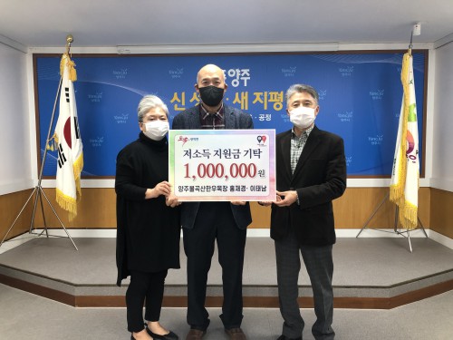 ¾çÁֽà ±¤Àû¸éÀº Áö³ 26ÀÏ ±¤Àû¸é ¼ÒÀç ¾çÁÖºÒ°î»êÇÑ¿ì¸ñÀå(´ëÇ¥ È«Àç°æ)¿¡¼ ¿¬¸»À» ¸Â¾Æ Äڷγª19·Î ¾î·Á¿òÀ» °Þ´Â ¼Ò¿Ü°èÃþÀ» À§ÇÑ ÀÌ¿ô»ç¶ûÀ» ½ÇõÇϰíÀÚ ¼º±Ý 100¸¸¿øÀ» ±âŹÇß´Ù°í ¹àÇû´Ù.