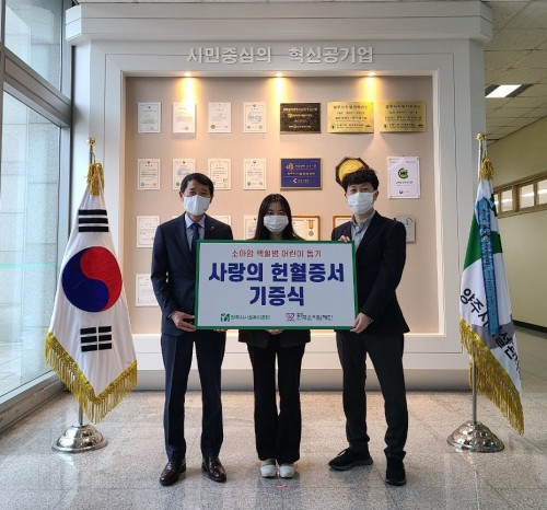 À̹ø¿¡ ±âÁõÇÑ ÇåÇ÷Áõ¼´Â ´ëÇÑÀû½ÊÀÚ»ç ¼¿ïµ¿ºÎÇ÷¾×¿ø°ú Çù¾÷ÇØ ¿ÃÇØ ¿¬ 5ȸ 223¸íÀÌ '»ý¸í³ª´® »ç¶ûÀÇ ÇåÇ÷Çà»ç'¿¡ ÀÚ¹ßÀûÀ¸·Î Âü¿©ÇÏ¿© ¹ÞÀº °ÍÀ¸·Î ¼Ò¾Æ¾ÏÀ¸·Î ¾î·Á¿òÀ» °Þ°í ÀÖ´Â ¹éÇ÷º´ ¾î¸°À̵鿡°Ô ÈûÀ» º¸Å°íÀÚ °ø´Ü ÀÓÁ÷¿øµéÀÌ ±âÁõÇÑ ÇåÇ÷Áõ¼ÀÌ´Ù.