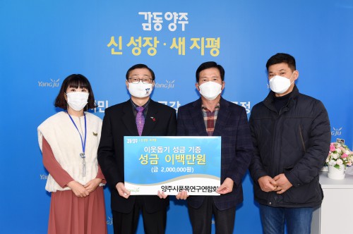 ¾çÁÖ½Ãǰ¸ñ¿¬±¸¿¬ÇÕȸ(ȸÀå ¹Ú¼ø¿ë)´Â 22ÀÏ ¾çÁÖ½Ãû ºÎ½ÃÀå½ÇÀ» ã¾Æ Äڷγª19 Àå±âÈ·Î ¾î·Á¿ò¿¡ óÇÑ ¼Ò¿Ü°èÃþÀ» À§ÇØ ½á´Þ¶ó¸ç ÀÌ¿ô»ç¶û ¼º±Ý 200¸¸¿øÀ» Àü´ÞÇß´Ù.