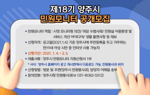 ¾çÁÖ½Ã(½ÃÀå À̼ºÈ£)´Â ¿À´Â 2¿ù 5ÀϱîÁö ½ÃÁ¤Àü¹Ý¿¡ ´ëÇÑ ½Ã¹ÎµéÀÇ ¹ßÀüÀûÀÎ ÀǰßÀ» ¼ö·ÅÇϱâ À§ÇØ Á¦18±â ¾çÁֽà ¹Î¿ø¸ð´ÏÅ͸¦ ¸ðÁýÇÑ´Ù.