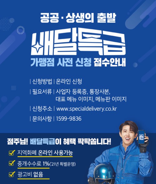 ½ÅûÀº ¾çÁֽà ³» ¹è´ÞÀÌ °¡´ÉÇÑ ½ÄÀ½·á¾÷ »ç¾÷ÀåÀ̶ó¸é ¾î´À °÷ÀÌµç °¡´ÉÇÏ¸ç ¹è´ÞƯ±Þ ȨÆäÀÌÁö(www.specialdelivery.co.kr)¿¡¼ »ç¾÷ÀÚµî·ÏÁõ, ÅëÀå»çº», ¸Þ´ºÆÇ À̹ÌÁö µîÀ» ÷ºÎÇØ ½ÅûÇÏ¸é µÈ´Ù.