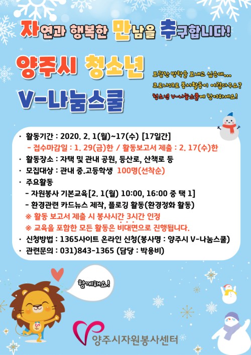 ¾çÁÖ½ÃÀÚ¿øºÀ»ç¼¾ÅÍ(¼¾ÅÍÀå ¹ÚÁ¾¼º)´Â ¿À´Â 2¿ù 1ÀϺÎÅÍ 17ÀϱîÁö ‘2021 ¾çÁֽà û¼Ò³â V-³ª´®½ºÄð’À» ¿î¿µÇÑ´Ù.