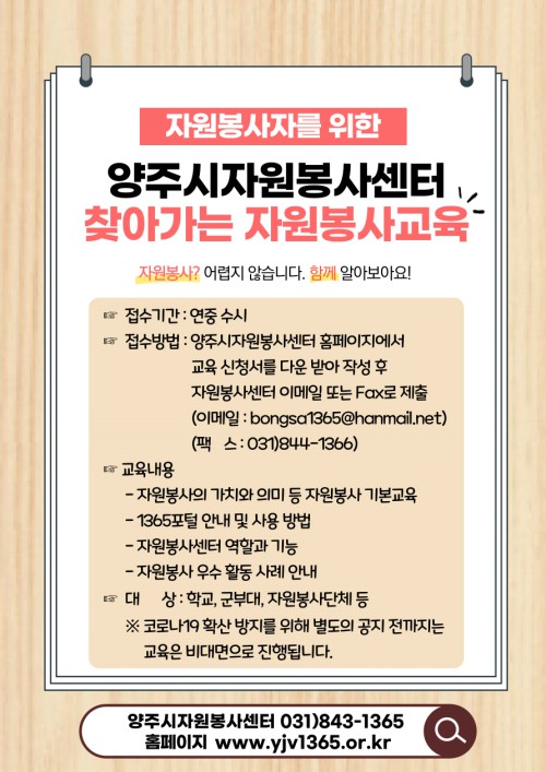 ±³À°½ÅûÀº ¾çÁÖ½ÃÀÚ¿øºÀ»ç¼¾ÅÍ È¨ÆäÀÌÁö(www.yjv1365.or.kr)¿¡¼ ±³À°½Åû¼¸¦ ³»·Á¹Þ¾Æ ÀÛ¼ºÇÑ ÈÄ ÆÑ½º(¢Ï031-844-1366), À̸ÞÀÏ(bongsa1365@hanmail.net)·Î Á¢¼öÇÏ¸é µÈ´Ù.