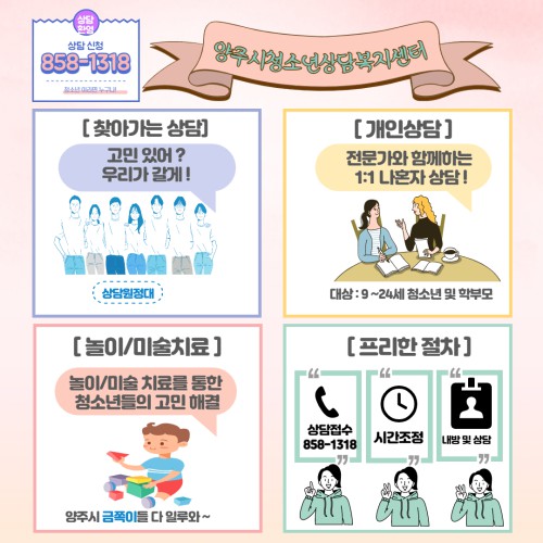 ¾çÁÖ½Ãû¼Ò³â»ó´ãº¹Áö¼¾ÅÍ(¼¾ÅÍÀå ÀÌ»óÇö)´Â °ü³»¿¡ ½É¸®Àû ¾î·Á¿òÀ» È£¼ÒÇϴ û¼Ò³âÀ» À§ÇØ »ó´ã ÇÁ·Î±×·¥ Âü¿©ÀÚ¸¦ ¿¬Áß ¸ðÁýÇÑ´Ù°í ¹àÇû´Ù.