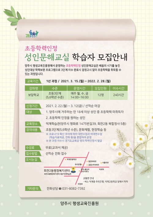¾çÁÖ½Ã(½ÃÀå À̼ºÈ£)´Â ¹è¿òÀÇ ½Ã±â¸¦ ³õÄ£ ºñ¹®ÇØ·ÀúÇз ¼ºÀÎÀ» ´ë»óÀ¸·Î 2021³â ÃʵîÇзÂÀÎÁ¤ ¼ºÀι®Çر³½Ç ÇÁ·Î±×·¥ ½ÅÀÔ»ýÀ» ¸ðÁýÇÑ´Ù.