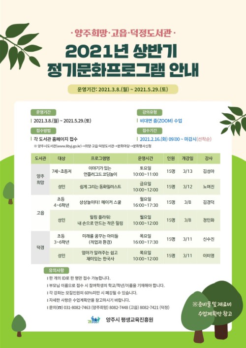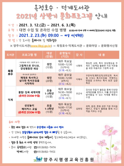 ¾çÁÖ½Ã(½ÃÀå À̼ºÈ£)´Â ¿À´Â 3¿ù 8ÀϺÎÅÍ 6¿ù 3ÀϱîÁö 2021³âµµ »ó¹Ý±â ºñ´ë¸é µ¶¼‧¹®ÈÇÁ·Î±×·¥À» ¿î¿µÇÑ´Ù.
