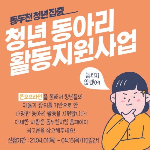 µ¿µÎõ½Ã´Â 4¿ù 1ÀϺÎÅÍ 4¿ù 15ÀϱîÁö û³âµéÀÇ Áö¿ª°øµ¿Ã¼ Âü¿© È®´ë¿Í ´Ù¾çÇÑ »çȸȰµ¿ °æÇèÀ» Áö¿øÇϱâ À§ÇØ Ã»³â µ¿¾Æ¸® Ȱµ¿ Áö¿ø »ç¾÷ÀÇ Âü¿©ÀÚ¸¦ ¸ðÁýÇÑ´Ù.