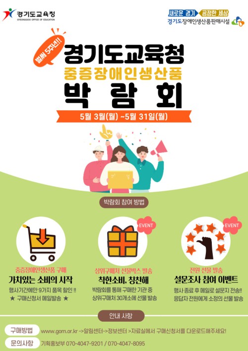 µµ±³À°Ã»Àº ¿ÃÇØºÎÅÍ ±¸¸Å È®´ë¸¦ À§ÇØ ±³Á÷¿ø°ú Çкθð, ÀϹݽùΠ´ë»óÀ¸·Î È«º¸¸¦ È®´ëÇÑ´Ù. ´©±¸³ª °æ±âµµÀå¾ÖÀλý»êǰÆÇ¸Å½Ã¼³ ¼îÇθô(https://www.gom.or.kr/)¿¡¼ ¾ðÁ¦µçÁö »óǰÀ» µÑ·¯º¸°í ±¸¸ÅÇÒ ¼ö ÀÖ´Ù.