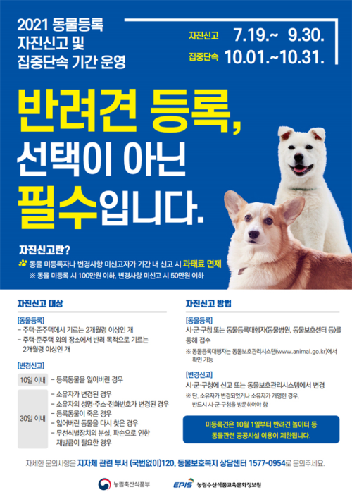À̹ø ÀÚÁø½Å°í ±â°£Àº 7¿ù 19ÀϺÎÅÍ ¿À´Â 9¿ù 30ÀϱîÁö·Î, µµ³» µ¿¹°º´¿ø µî ÁöÁ¤µÈ µî·Ï´ëÇà±â°ü¿¡¼ µ¿¹°µî·Ï ½ÅûÀÌ °¡´ÉÇÏ´Ù. ½ÅûÀÌ Á¢¼öµÇ¸é °üÇÒ ½Ã±º¿¡¼ ½ÂÀÎ ÈÄ ¼ÒÀ¯ÀÚ¿¡°Ô µ¿¹°µî·ÏÁõÀ» ¹ß±ÞÇÑ´Ù.