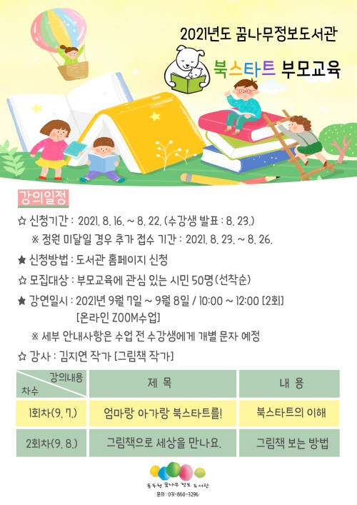 µ¿µÎõ½Ã Æò»ý±³À°¿ø ²Þ³ª¹«Á¤º¸µµ¼°ü¿¡¼´Â ºÎ¸ð±³À°¿¡ °ü½É ÀÖ´Â ½Ã¹Î 50¸í ´ë»óÀ¸·Î 9¿ù 7ÀϺÎÅÍ 9¿ù 8ÀϱîÁö ÀÌÆ²°£ ºÏ½ºÅ¸Æ® ºÎ¸ð±³À° Ư°À» ¿î¿µÇÑ´Ù.