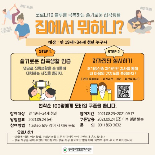 ¸¸19∼34¼¼ û³âÀÌ¸é ´©±¸³ª Âü¿© °¡´ÉÇϸç, µ¿µÎõ½ÃÁ¤½Å°Ç°º¹Áö¼¾ÅÍ È¨ÆäÀÌÁö¿¡ ½½±â·Ó°Ô Áñ±â´Â ÁýÄÛ»ýȰ »çÁøÀ» ´ñ±Û·Î ¿Ã¸° ÈÄ, Á¶±âÁ¤½ÅÁõ ÀÚ°¡Áø´Ü °Ë»ç¸¦ ÅëÇØ ¸¶À½ÀÇ °Ç°µµ¸¦ ÃøÁ¤ÇÏ´Â ¹æ¹ýÀ¸·Î ÁøÇàÇÏ¸ç ¼±Âø¼ø 100¸í¿¡°Ô ¼ÒÁ¤ÀÇ e-ÄíÆùÀ» Á¦°øÇÑ´Ù.