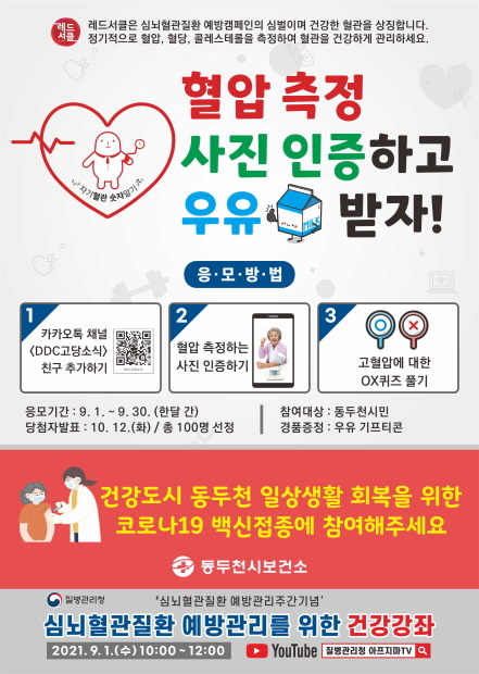 µ¿µÎõ½Ãº¸°Ç¼Ò´Â ½É³úÇ÷°üÁúȯ ¿¹¹æ°ü¸®ÁÖ°£À» ¸Â¾Æ 9¿ù ÇÑ´Þ µ¿¾È ·¹µå¼Å¬ Ä·ÆäÀÎÀ» ½Ç½ÃÇÑ´Ù. ·¹µå¼Å¬Àº °Ç°ÇÑ Ç÷°üÀ» »ó¡Çϸç ÀÚ½ÅÀÇ Ç÷¾Ð, Ç÷´ç, ÄÝ·¹½ºÅ×·Ñ ¼öÄ¡¸¦ ¾Ë°í °ü¸®ÇÏ¿© ½É³úÇ÷°üÁúȯÀ» ¿¹¹æÇÏÀÚ´Â ¶æÀ» ´ã°í ÀÖ´Ù.