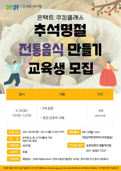 ¾çÁÖ½Ã(½ÃÀå À̼ºÈ£)°¡ ¹ÎÁ· ´ë¸íÀý Ãß¼®À» ¸Â¾Æ ÀüÅë ¸íÀýÀ½½ÄÀ» ¸¸µé¾î ¸Àº¼ ¼ö ÀÖ´Â ‘¿ÂÅÃÆ® ÀüÅëÀ½½Ä ¸¸µé±â ÄíŷŬ·¡½º’¿¡ Âü¿©ÇÒ ¼ö°»ýÀ» ¿À´Â 13ÀϱîÁö ¸ðÁýÇÑ´Ù.