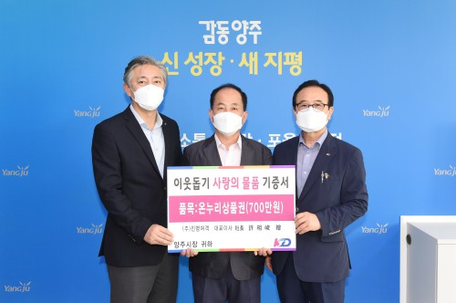 ¾çÁÖ½Ã(½ÃÀå À̼ºÈ£)´Â Áö³ 8ÀÏ ¢ßÁø¸í¿©°´(º»ºÎÀå À¯°æÁ¾)¿¡¼ ½ÃûÀ» ¹æ¹®ÇØ °ü³» ¼Ò¿ÜµÇ°í ¾î·Á¿î ÀÌ¿ôµéÀÌ °Ç°ÇÑ Ãß¼® ¸íÀýÀ» º¸³¾ ¼ö ÀÖµµ·Ï ½á´Þ¶ó¸ç ¿Â´©¸®»óǰ±Ç 1¸¸¿ø±Ç 700¸Å¸¦ ±âºÎÇß´Ù.