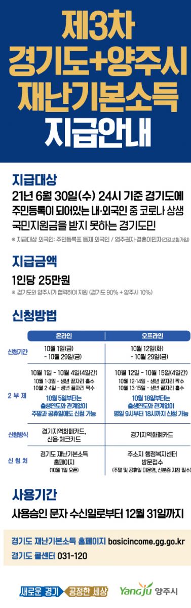 ¾çÁÖ½Ã(½ÃÀå À̼ºÈ£)´Â 1ÀϺÎÅÍ 29ÀϱîÁö Á¤ºÎ°¡ Áö±ÞÇÏ´Â »ó»ý ±¹¹ÎÁö¿ø±ÝÀ» ¹ÞÁö ¸øÇÑ ¾çÁֽùο¡°Ô °æ±âµµ¿Í ÇÔ²² º°µµ Àç¿øÀ» ÅõÀÔÇØ 1Àδç 25¸¸¿ø¾¿ Á¦3Â÷ °æ±âµµ À糱⺻¼ÒµæÀ» Áö±ÞÇÑ´Ù.