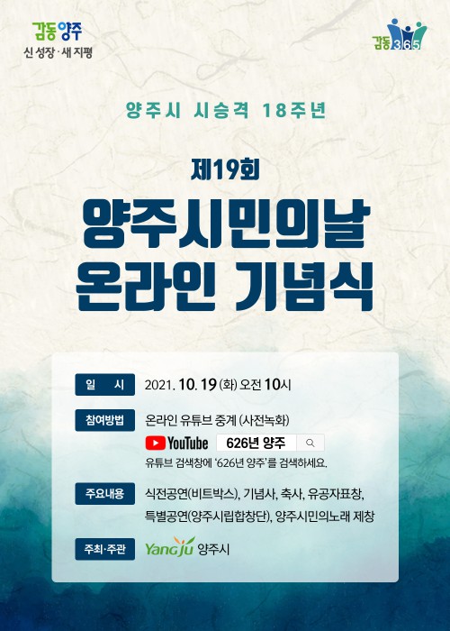 ¾çÁÖ½Ã(½ÃÀå À̼ºÈ£)´Â 19ÀÏ ½Ã ½Â°Ý 18ÁÖ³âÀ» ÃàÇÏÇÏ´Â ‘¾çÁֽùΠÈÇÕÀÇ Àå’ Á¦19ȸ ¾çÁֽùÎÀÇ ³¯ ±â³ä½ÄÀ» ¿Â¶óÀÎÀ¸·Î °³ÃÖÇß´Ù°í ¹àÇû´Ù.