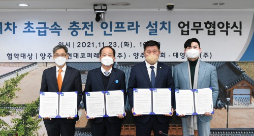 ¾çÁÖ½Ã(½ÃÀå À̼ºÈ£)´Â 23ÀÏ ½Ãû »óȲ½Ç¿¡¼ ¾çÁÖ½ÃÀÇȸ, Àü±âÂ÷ ÃÊ±Þ¼Ó ÃæÀü±â Àü¹®±â¾÷ ´ë¿µÃ¤ºñ(ÁÖ), Á¾ÇÕ¹«¿ª»ó»ç Çö´ëÄÚÆÛ·¹À̼Ç(ÁÖ)°ú ¼ÕÀâ°í ‘Àü±âÀÚµ¿Â÷ ÃÊ±Þ¼Ó ÃæÀü ÀÎÇÁ¶ó ±¸ÃàÀ» À§ÇÑ ¾÷¹«Çù¾à’À» ü°áÇß´Ù.