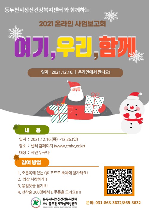 µ¿µÎõ½Ã Á¤½Å°Ç°º¹Áö¼¾ÅÍ¿¡¼´Â ¿ÃÇØ Á¤½Å°Ç° ÁõÁø»ç¾÷À» ¸¶¹«¸®ÇÏ¸é¼ 12¿ù 16ÀϺÎÅÍ 12¿ù 26ÀϱîÁö 2021³â »ç¾÷º¸°íȸ¸¦ ¿Â¶óÀÎÀ¸·Î ÁøÇàÇÑ´Ù.