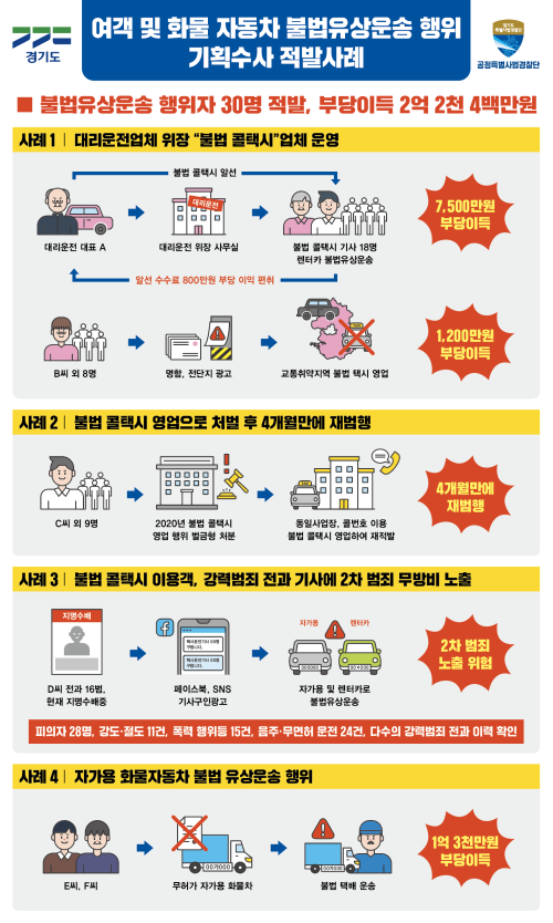 ÀÚ°¡¿ëÀ̳ª ·»ÅÍÄ«¸¦ ÀÌ¿ëÇØ ºÒ¹ýÀ¸·Î Åýÿµ¾÷, ÀÏ¸í ‘ÄݶٱⒸ¦ ÇÑ ÀÏ´ç°ú Çã°¡ ¾øÀÌ ÀÚ°¡¿ëȹ°Â÷·Î ¿î¼ÛÀ» ÇÏ°í µ·À» ¹ÞÀº ȹ°Â÷ÁÖ µî 30¸íÀÌ °æ±âµµ Ư»ç°æ ¼ö»ç¸Á¿¡ ´ú¹Ì¸¦ ÀâÇû´Ù. À̵é Áß¿¡´Â °·Â¹üÁË Àü°ú¿¡ Áö¸í¼ö¹è ÁßÀÎ ±â»çµµ ÀÖ¾î ÀÌ¿ëÀڵ鿡 ´ëÇÑ 2Â÷ ¹üÁ˵µ ¿ì·ÁµÈ´Ù.