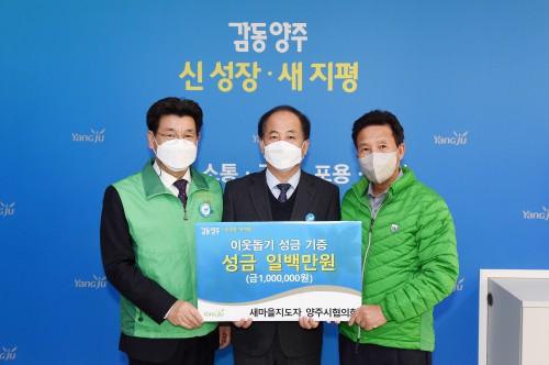 Áö³ 23ÀÏ »õ¸¶À»ÁöµµÀÚ ¾çÁÖ½ÃÇùÀÇȸ(ȸÀå ÀÌÁ¾¿ë)¿Í ¾çÁֽûõ¸¶À»ºÎ³àȸ(ȸÀå ¹Ú¼øÈñ)¿¡¼ Çö±Ý 100¸¸¿ø°ú 200¸¸¿øÀ» °¢°¢ ±âºÎÇß°í Áö³ 21ÀÏ ´ëÇѹα¹»óÀ̱º°æÈ¸(ȸÀå À¯À»»ó)¿¡¼ ¹é¹Ì 10kg 200Æ÷(620¸¸¿ø »ó´ç), ¿ÁÁ¤¿ì¸®À¯Ä¡¿ø(¿øÀå ¹ÚÇö¼÷)¿¡¼ Çö±Ý 91¸¸¿øÀ» ±âŹÇß´Ù.