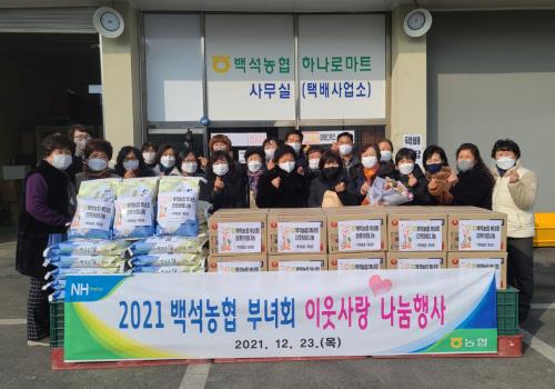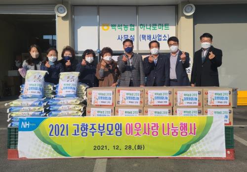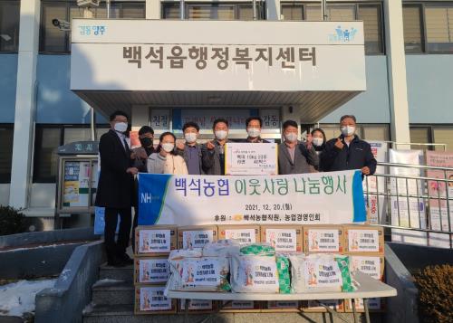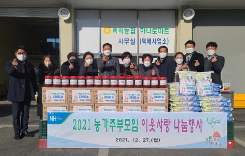 ¹é¼®³óÇù ÀÓÁ÷¿øµé°ú ³ó¾÷°æ¿µÀÎȸ(ȸÀå ÀÓµ¿È£)´Â 12¿ù20ÀÏ ¾î·Á¿î ÀÌ¿ôµéÀ» À§ÇØ ½á´Þ¶ó¸ç ½Ò(10§¸) 20Æ÷¿Í ¶ó¸é 40¹Ú½º¸¦ ¹é¼®À¾ ÇàÁ¤º¹Áö¼¾ÅÍ(À¾Àå °íÀ±±¸)¿¡ Àü´ÞÇß´Ù.