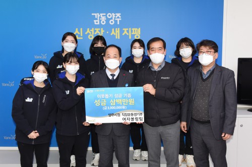 ¾çÁÖ½Ã(½ÃÀå À̼ºÈ£)´Â Áö³ 29ÀÏ ¾çÁÖ½Ãû Á÷Àå¿îµ¿°æ±âºÎ ¿©ÀÚº¼¸µ¼±¼ö´Ü(°¨µ¶ ³²»óÄ¥)¿¡¼ °ü³» Ãë¾à°èÃþÀ» À§ÇØ ½á´Þ¶ó¸ç ÀÌ¿ôµ½±â ¼º±Ý 300¸¸¿øÀ» ±âºÎÇß´Ù°í ¹àÇû´Ù.