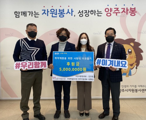 ¢ß´ë¹Úö°»ê¾÷ ¾çÁÖÁöÁ¡(´ëÇ¥ ÀÓÇüºó)°ú ¢ßÁø¹Ìȯ°æ(´ëÇ¥ ±èÁø±¤)Àº 31ÀÏ ¾çÁÖ½ÃÀÚ¿øºÀ»ç¼¾Å͸¦ ¹æ¹®ÇØ °ü³» Ãë¾à°èÃþÀ» À§ÇØ ½á´Þ¶ó¸ç ÀÌ¿ôµ½±â ¼º±Ý 500¸¸¿øÀ» ±âŹÇß´Ù.