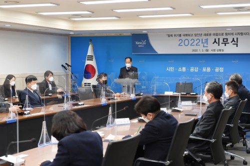 ¾çÁÖ½Ã(½ÃÀå À̼ºÈ£)´Â 4ÀÏ ½Ãû »óȲ½Ç¿¡¼ ‘2022³â ÀÓÀγâ(ìóìÙÒ´) ½Ã¹«½Ä’À» ¿°í ‘Äڷγª19·Áö¿ª°æÁ¦ ±Øº¹, ½Å¼ºÀå ¹Ì·¡µµ½Ã µµ¾à’À» ÁغñÇÏ´Â »õÇØ ÈûÂù ù ¹ß°ÉÀ½À» ³»µðµ±´Ù.