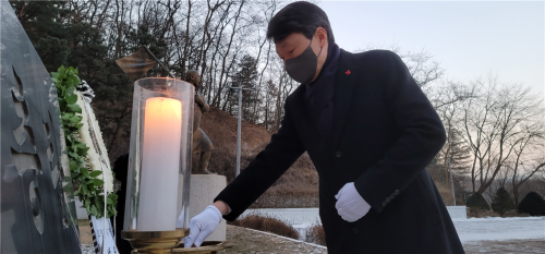 À̳¯ ÇöÃæÅ¾ Âü¹è¿¡´Â ´õºÒ¾î¹ÎÁÖ´ç ¼Ò¼Ó ¿À¿µÈ¯ ±¹È¸ÀÇ¿ø°ú ÀÇÁ¤ºÎ½Ã °©, À»ÀÇ °æ±âµµÀÇ¿ø ¹× ÀÇÁ¤ºÎ ½ÃÀÇ¿ø µî ÃÖ¼Ò Àοø¸¸ Âü¿©ÇÑ °¡¿îµ¥ ÁøÇàµÇ¾ú´Ù. ±è¹Îö ÀÇ¿øÀº À̳¯ Âü¹è½Ä¿¡¼ “¼ø±¹¼±¿°ú È£±¹¿µ·ÉÀÇ ¶æÀ» ±â¸®¸ç ¿ÃÇØµµ °â¼ÕÇÑ ¸¶À½À» °¡Áö°í Á÷½ÉÇʼöÀÇ °¢¿À·Î °æ±âºÏºÎ¿Í ÀÇÁ¤ºÎ¸¦ À§ÇØ ÃÖ¼±À» ´ÙÇϰڴÙ.”°í ¸»Çß´Ù.