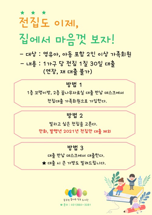 ¿µÀ¯¾Æ, ¾Æµ¿ Æ÷ÇÔ 2ÀÎ ÀÌ»ó °¡Á·È¸¿øÀÌ¸é °ü½ÉºÐ¾ß¿¡ ¸Â´Â ÀüÁý 1ÁúÀ» 30ÀÏ µ¿¾È ºô¸± ¼ö ÀÖ´Ù. ÀÛ³âºÎÅÍ ½ÃÀÛÇÑ ÀüÁý´ëÃâÀº È£ÀÀÀÌ ÁÁ¾Æ ¿ÃÇØ´Â ½Å°£ ÀüÁýÀ» ´õ ¸¹ÀÌ ºô·Á°¥ ¼ö ÀÖµµ·Ï ´ëÃâ°¡´É ÀüÁýÀ» È®´ë ¿î¿µÇÑ´Ù.