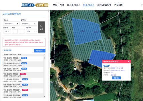 µµÀ¯ÁöÁ¤º¸Áöµµ´Â µµ°¡ ¼ÒÀ¯ÇÑ µµÀ¯Àç»ê(ÅäÁö)ÀÇ ÇöȲÀ» Áöµµ·Î È®ÀÎÇϰí, µµ¹ÎÀÌ È°¿ë °¡´ÉÇÑ À¯ÈÞ ºÎÁö¸¦ ã¾Æ ´ã´ç ºÎ¼¿¡ ´ëºÎ °ü·Ã ¹®ÀǸ¦ ÇÒ ¼ö ÀÖ´Â ¼ºñ½º´Ù.
