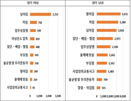 ¼ºº° ¹ß»ýÇüŸ¦ º¸¸é ¿©¼ºÀº ³Ñ¾îÁü(37.7%), ³¢ÀÓ(12.0%), ¾÷¹«»ó Áúº´(10.0%) µîÀÇ ¼øÀÎ ¹Ý¸é, ³²¼ºÀº ¶³¾îÁü(16.7%), ³¢ÀÓ(15.1%), ³Ñ¾îÁü(13.8%) µîÀÇ ¼øÀÌ´Ù.