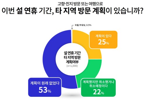 °æ±âµµ°¡ Áö³ 15ÀÏ µµ¹Î 1,000¸íÀ» ´ë»óÀ¸·Î ½Ç½ÃÇÑ Äڷγª19 °ü·Ã ±ä±Þ ¿©·ÐÁ¶»ç¿¡ µû¸£¸é ¼³ ¿¬ÈÞ ±â°£¿¡ Ÿ Áö¿ªÀ¸·Î °íÇâ·Ä£Áö ¹æ¹®À̳ª ¿©Çà °èȹÀÌ ÀÖ´ÂÁö¿¡ ´ëÇØ¼´Â 53%°¡ °èȹÀÌ ¾ø´Ù°í ´äÇß´Ù. ‘Ãë¼ÒÇ߰ųª Ãë¼ÒÇÒ ¿¹Á¤’Àº 22%, 25%´Â ‘°èȹÀÌ ÀÖ´Ù’°í ´äÇß´Ù.
