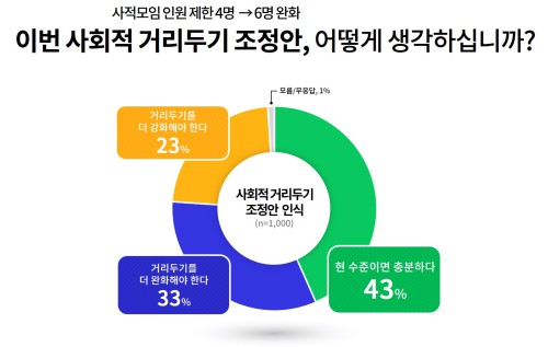 17ÀϺÎÅÍ ¼³ ¿¬ÈÞ°¡ ³¡³ª´Â 2¿ù 6ÀϱîÁö 3ÁÖ°£ Àû¿ëµÇ´Â »çȸÀû °Å¸®µÎ±â Á¶Á¤¾È(ÇöÇà »çȸÀû °Å¸®µÎ±â À¯Áö, »çÀû¸ðÀÓ Àοø¼ö¸¸ 4¸í¿¡¼ 6¸íÀ¸·Î ¿ÏÈ)¿¡ ´ëÇØ µµ¹Î 43%´Â ‘Çö ¼öÁØ(6¸í ¿ÏÈ)À̸é ÃæºÐÇÏ´Ù’°í ÀÀ´äÇß´Ù.