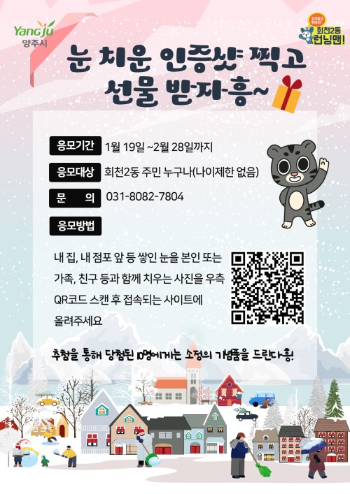 ¾çÁֽà ȸõ2µ¿(µ¿Àå È«¹Ì¿µ)Àº 2022 ÀÓÀγâÀ» ¸ÂÀÌÇØ ¿À´Â 2¿ù 28ÀϱîÁö‘³» Áý ¾Õ, ³» Á¡Æ÷ ¾Õ ´« Ä¡¿ì±â ÀÎÁõ¼¦ À̺¥Æ®’¸¦ ½ÃÇàÇÑ´Ù°í ¹àÇû´Ù.
