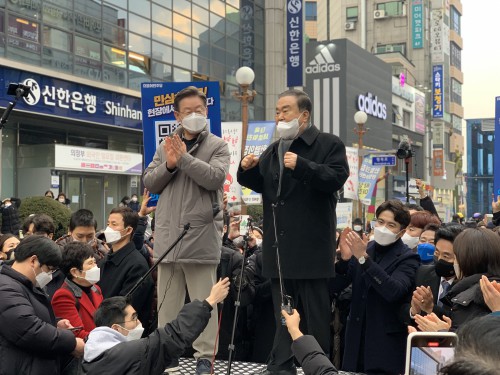 ÀÌÀç¸í ´õºÒ¾î¹ÎÁÖ´ç ´ë¼±È帰¡ 25ÀÏ ÀÇÁ¤ºÎ Çູ·Î ½Ã¹Î±¤ÀåÀ» ¹æ¹®ÇØ, ÀÇÁ¤ºÎÀÇ 7´ë °ø¾à ¹ßÇ¥¿Í ÇÔ²² ÁöÁö¸¦ È£¼ÒÇß´Ù.
